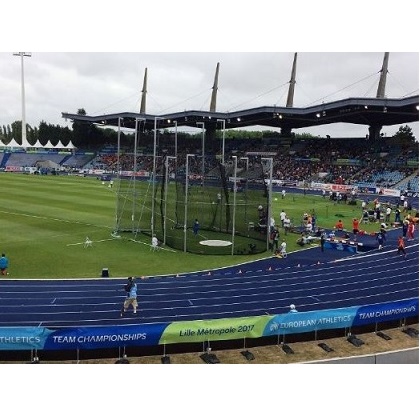 Alle Rahme sind von innen versärkt bis zu einer Höhe von 2.40m, ohne eine Brechpunkt. Netze (verrottungssicher, 5 mm Durchmesser, Polypropylene, 40 x 40 mm Maschen, sejr widerstandsfähig, schwarz, EN-1263-1 zertifiziert) verhindern das Abprallen und zurückprallen auf den Athleten oder über den Käfig. Entspricht I.A.A.F Regeln. Leicht zu bedienen mit Nylon Rollen. Geliefert mit Hülle und Netz. Hergestellt in EU.