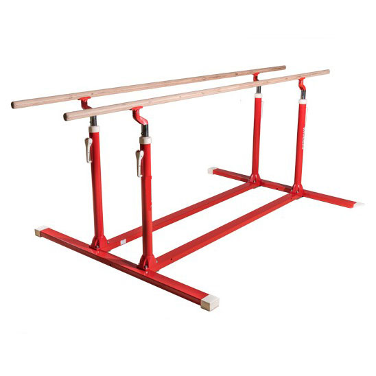 Dieser Barren mit fixem Unterbau ist ideal für jene, die die Ausrüstung für jede Turneinheit extra auf- und abbauen müssen. Höhe einstellbar von 1,15 bis 1,85 m, und zwar durch ein System aus Verriegelungskerben und Daumenrädern. Der Abstand zwischen den Holmen ist von 37,50 bis 65 cm einstellbar, und zwar mittels „Schwanenhälsen“ aus Verbundmaterial. Unterbau mit rutschhemmenden Pads. Der Barren kann mit oder ohne die maßgeschneiderte Faltmatte erworben werden.