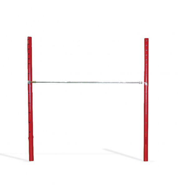 Reck mit Stahlrohr-Pfosten (Durchmesser 90 mm) In eine Verschalung eingebaut und händisch gespannt. Stangen mittels omnidirektionaler Drehgelenke montiert, um ruckartige Bewegungen zu vermeiden. Höhe zwischen 0,95 und 2,55 m einstellbar. Abstand zwischen den Pfosten entweder 2,40 m oder 2,54 m. Reckstange im Lieferumfang. Kann auch zusammen mit Stufenbarren-Holm verwendet werden. Dieser Typ von seillosem Reck erfordert die Einrichtung von Pfostenverschalungen im Boden.