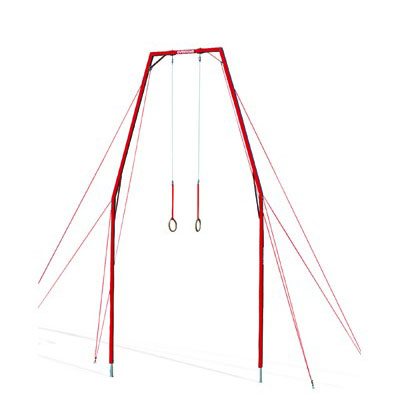 Ringegerüst mir einstellbarer Elastizität (von „normal“ bis „sehr nachgiebig“), passt sich an das Gewicht und den Stil des Turners an. Aufgrund der hohen Stoßabsorpsions-Fähigkeit können Übungen wiederholt ausgeführt werden, wobei Ermüdung und die Gefahr von Überlastungsverletzungen reduziert werden. Durch die ausgestellte Form bleibt die Landezone frei, sodass maximale Sicherheit beim Abspringen gewährleistet wird. Die Seillänge der Ringe ist voreingestellt, und das Gerät wird zusammen mit einem Haken zum Auffangen und Stabilisieren der Ringe geliefert.