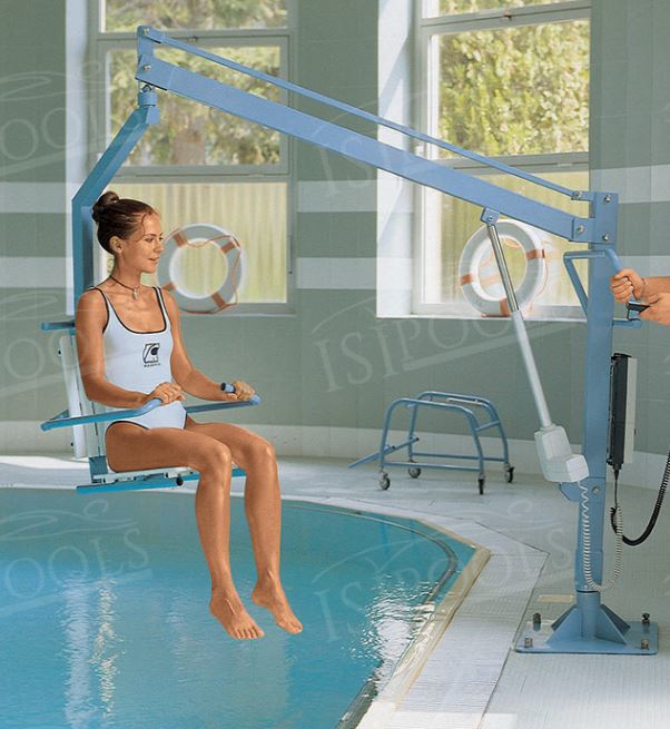 Elektrisches Hebesystem für Schwimmbäder, aus lackiertem rostfreiem Stahl hergestellt mit abnehmbarer und wiederaufladbarer Batterie. Komplett mit einem selbstausgleichendem Sessel, hat flexible Armlähnen und eine mobile Basis