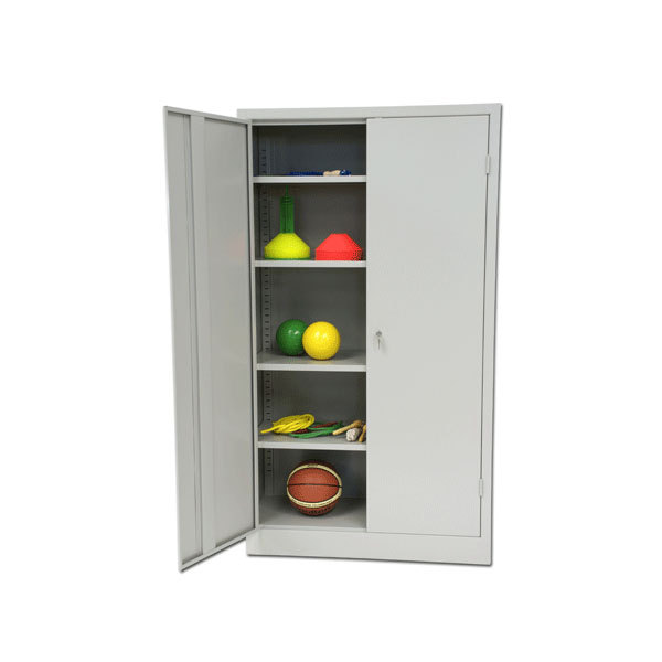 Hersgestellt aus Tafelblech mit EP-Beschichtung, 4 Regalen, 2 Türen nach außen angeschlagen. Hergestellt in der EU.