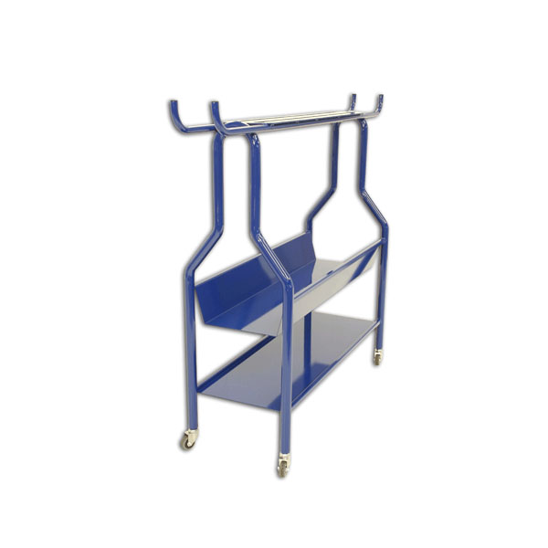 [Lackierter Stahl, 3 Regale, 4 Gummiräder. Aufnahmefähigkeit:] 40 Schwungkeulen, 100 Stöcke, 60 Aufstützen, 25 Hula-Hoop Reifen, 25 Springseile. Hergestellt in der EU.