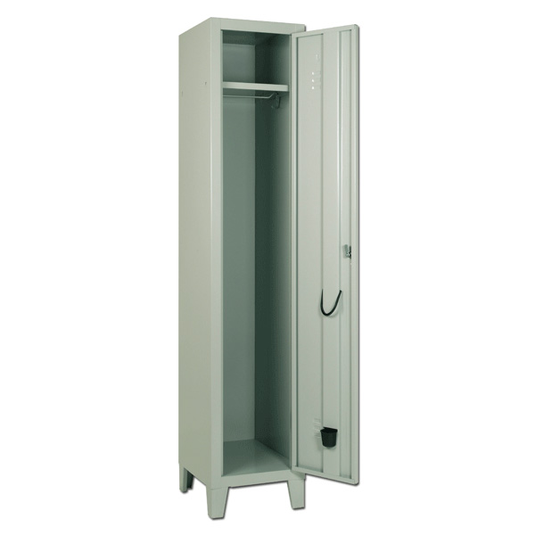 Kleiderschrank aus lackiertem Stahlblech mit 1 Tür. Abmessungen 37x35x180 cm.Verstärkte Tür mit Luftlöchern, Platz für Namenbezeichnung und Schlüsselverriegelungssystem, Innen-Ausstattung: 1 Regal, eine Stange mit Haken, Seitenhaken, einem Schirmhalter und Wasserbehälter. Hergestellt in der EU.
