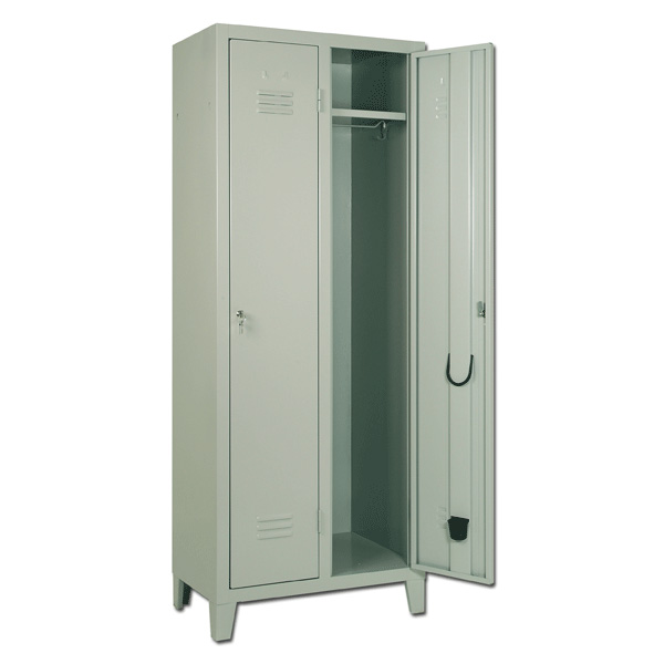 Kleiderschrank aus lackiertem Stahlblech mit 2 Türen. Abmessungen 75х35х180 cm.Verstärkte Tür mit Luftlöchern, Platz für die Namenbezeichnung und Schlüsselverriegelungssystem, Innen-Ausstattung: 1 Regal, einer Stange mit Haken, Seitenhaken, einem Schirmhalter und Wasserbehälter. Hergestellt in der EU.