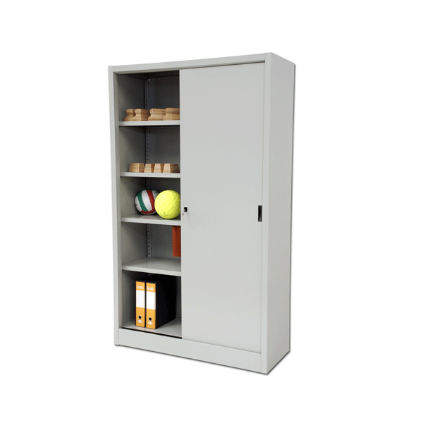 Hergestellt aus lackiertem Stahlblech, innen mit 4 Regalen und Schiebetüren, Abmessungen 120x45x200 cm. Schlüsselverschluss. Hergestellt in der EU.