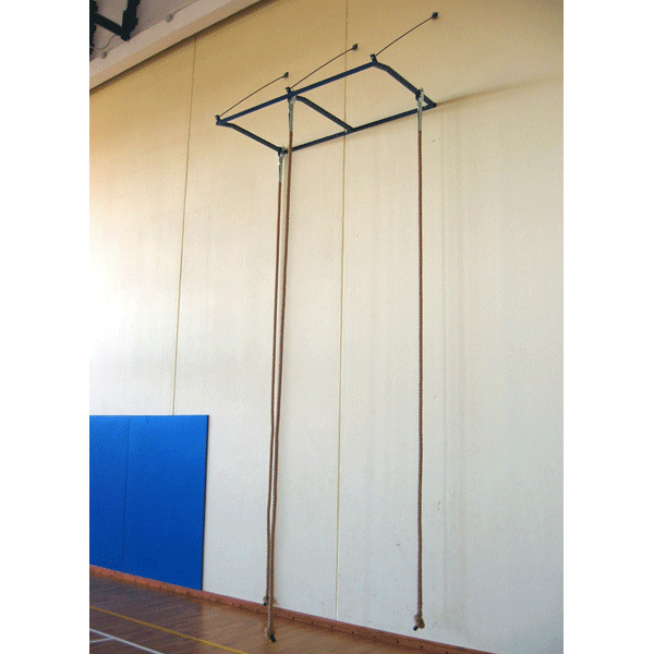 Rahmen aus Stahl, lackiert, Wandbefestigung. Zu dem Rahmen kann Wandkletterausrüstung (Kletterseile, Stangen und Leiter) befestigt werden. Bei Bedarf lässt sich der Rahmen an die Wand klappen, um Platz zu sparen, wenn die Ausrüstung nicht verwendet wird. Am Rahmen können zwei bzw. drei Elemente montiert werden. Hergestellt in der EU.